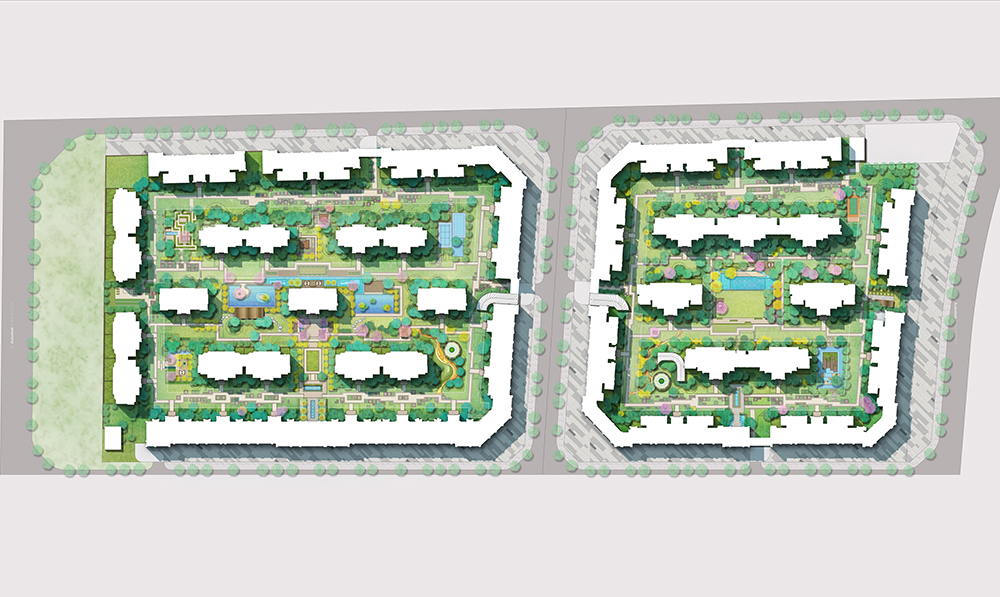 西派城分为ABCDE五个组团开发,另外预留了一个地块预拟定为社区公园的政府规划用地以及一个社区配套幼儿园。该项目是AB地块,景观总面积为68000㎡。社区外围为配套商业设施,内部涵盖了中庭水景休憩区、全龄活动区、社区农场、儿童树屋、雨水花园、波光喷泉、植物迷宫及会客厅式架空层等功能。
